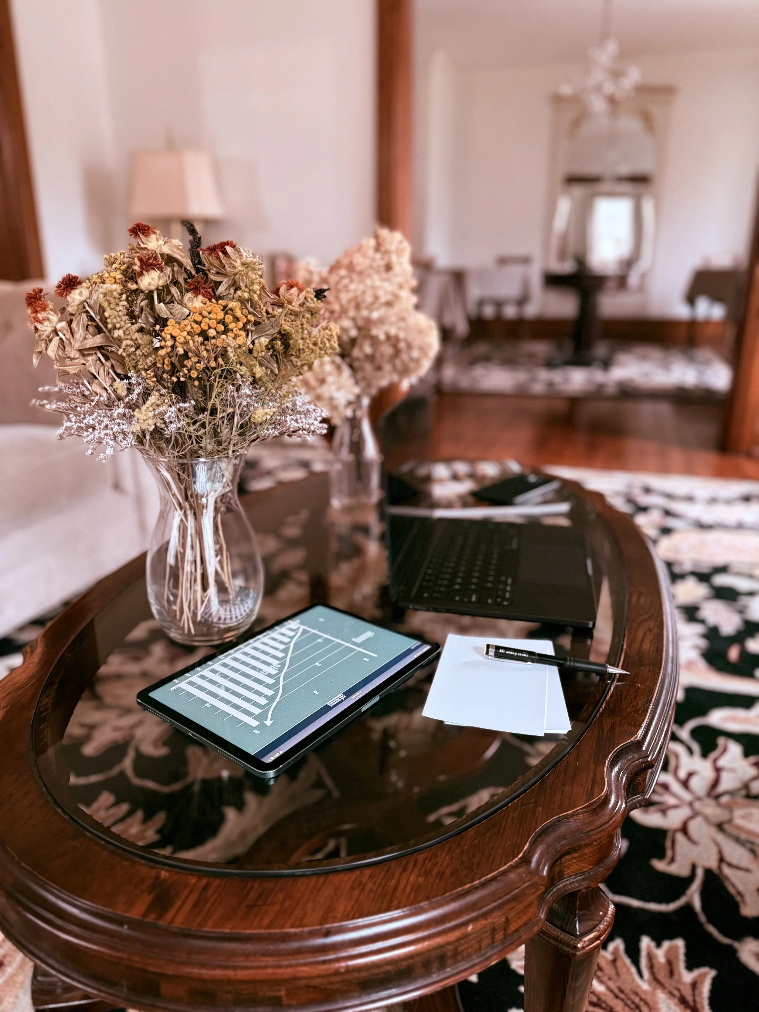 A wooden table with a vase of dried flowers, a tablet displaying a graph, a closed laptop, a pen, and a notepad with some papers in a cozy room with floral carpet and sitting area.